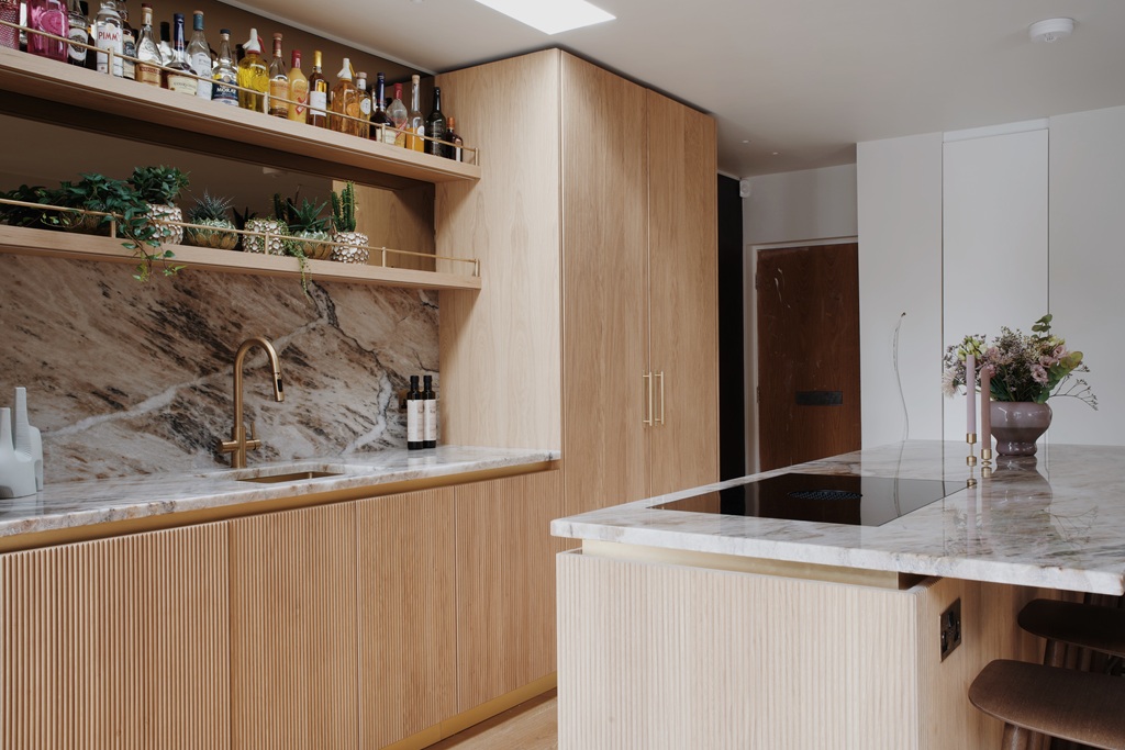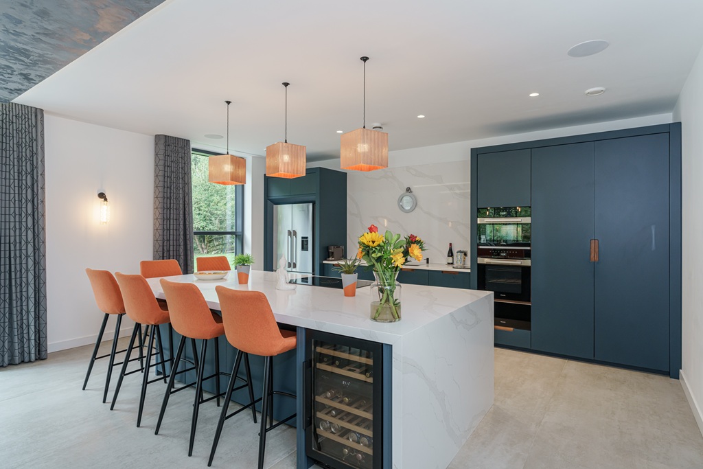 This option features 3 quartz slabs ideal for L-shaped kitchens with an island complete with mitred waterfall panels, delivering luxury, style, and seamless functionality to elevate your open-plan living with premium-quality quartz worktops.